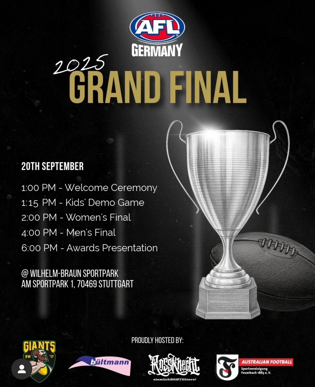 Am 20. September findet im Wilhelm-Braun-Sportpark wieder das Finale um die Deutsche Meisterschaft der AFL Germany statt. Unsere Aussie Rules Abteilung, die das Finale mit veranstaltet, freut sich über zahlreiche Besucherinnen und Besucher. Für Kinder, die gerne die dynamsiche Sportart kennenlernen möchten, findet ein Demo-Spiel zum Mitmachen statt.
