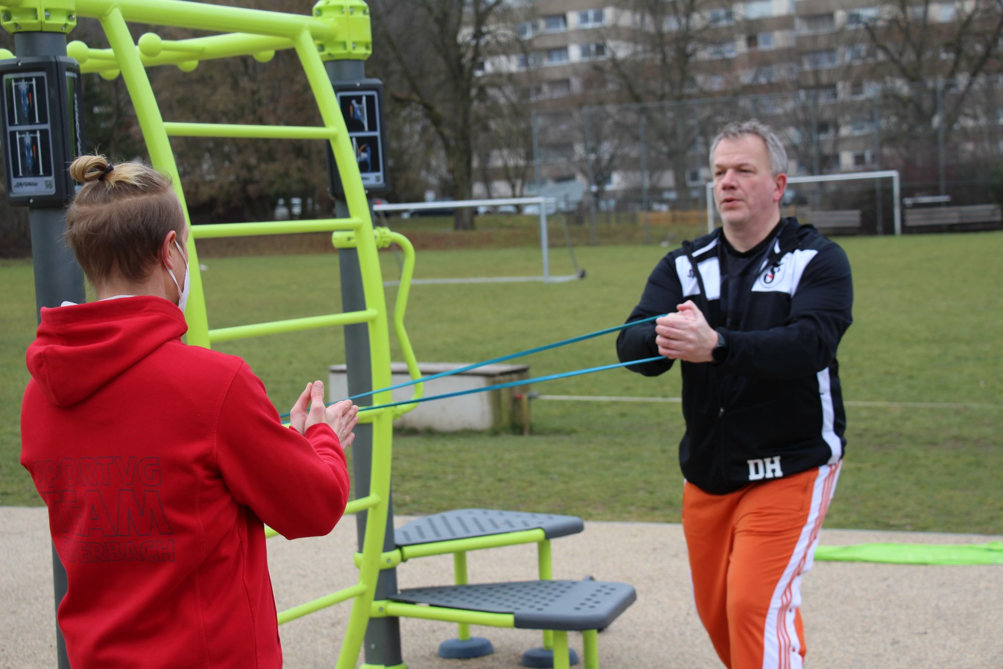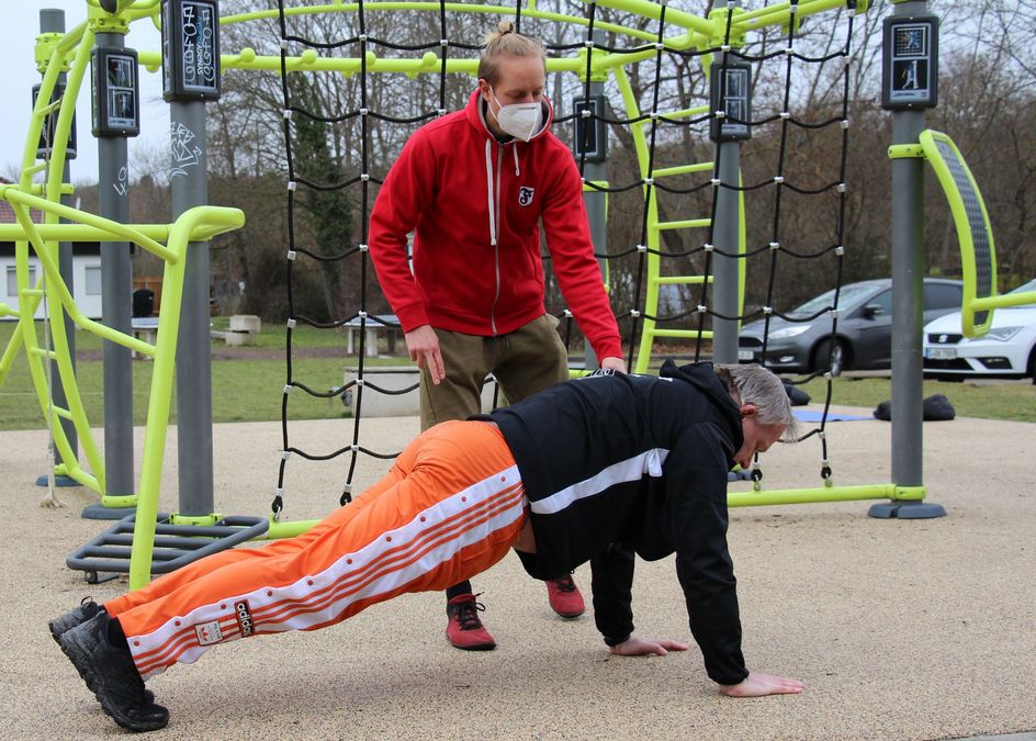 Anfang Februar haben sich dann Gideon und Dirk vor dem Vitadrom an unserem Outdoor-Trainingscenter SYNRGY getroffen. Die Trainingsinhalte waren schnell gefunden: Beweglichkeit und die Stabilität v.a. der hinteren Muskelketten standen bei der Übungsauswahl im Fokus. Wichtig im Personal Training ist immer, dass die Übungen auch ohne großen Aufwand vom Sportler eigenständig durchgeführt werden können. Dirk hat darüber hinaus auch noch wichtige Impulse für seine eigene Jugendtrainertätigkeit bekommen.